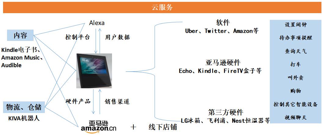 2.亞馬遜具有深厚的電商基礎,并在內容、硬件、平臺、云計算、物流倉儲等領域布局,通過智能音箱整合軟件+硬件+平臺+內容資源,進一步盤活電商資源。