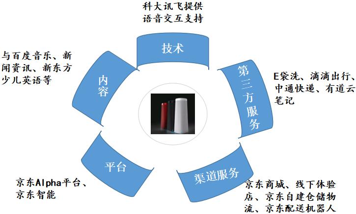 2.通過強強聯(lián)合的方式,京東通過電商平臺優(yōu)勢,整合行業(yè)中的技術廠商、內容廠商及第三方服務廠商,并發(fā)起“京東智能音頻聯(lián)盟”,向聯(lián)盟內成員輸出“JD+智能音頻解決方案”,實現(xiàn)叮咚音箱產(chǎn)品與優(yōu)質內容、服務的結合。