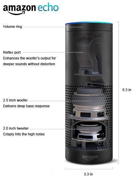 以Echo音箱為例,Echo采用封閉式揚聲器設計,高音和低音喇叭上下相對,聲音各個方向是對稱的,這有利于前端信號處理,但音效會受到限制。