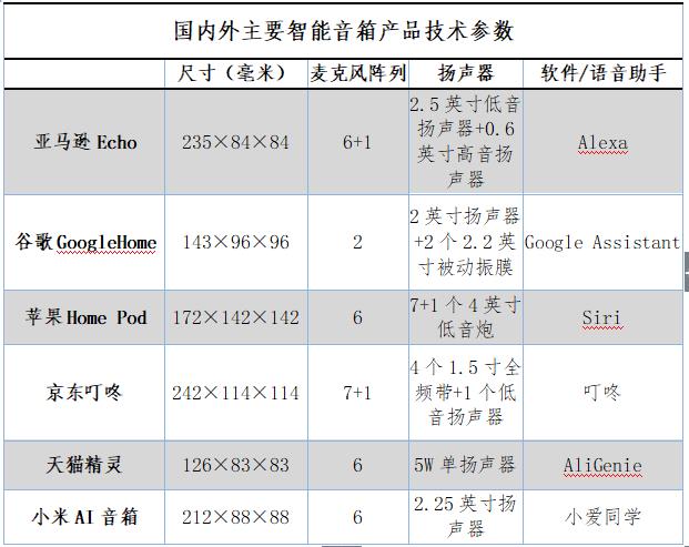 國內外主要智能音箱產(chǎn)品技術參數(shù)