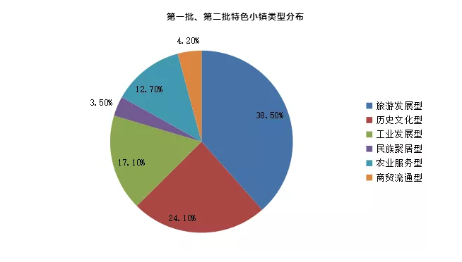 結合住建部推薦工作的通知,特色小鎮(zhèn)的類型主要有工業(yè)發(fā)展型、歷史文化型、旅游發(fā)展型、民族聚居型、農(nóng)業(yè)服務型和商貿(mào)流通型,經(jīng)過整理分析,旅游發(fā)展型的特色小鎮(zhèn)數(shù)量最多,為155個,占總數(shù)的38.5%;其次為歷史文化型特色小鎮(zhèn),數(shù)量為97個,占比為24.1%