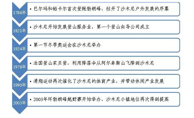 沙木尼小鎮(zhèn)(Chamonix)位于法國中部東側(cè),毗鄰意大利和瑞士,坐落于阿爾卑斯主峰勃朗峰腳下的山谷里。作為現(xiàn)代登山運動發(fā)源地,長住居民僅1.3萬人的沙木尼被稱為戶外愛好者的樂園、滑雪者的天堂,每年需接待超過200萬的登山滑雪者和日常游客。沙木尼小鎮(zhèn)能成為戶外運動的天堂,原因主要有二:其一,小鎮(zhèn)海拔1035米且位于山谷中,是理想的登山活動出發(fā)點;阿爾卑斯山的主峰勃朗峰為小鎮(zhèn)帶來獨一無二的登山資源;其二,17868月獵人杰克·巴爾瑪和醫(yī)生米歇爾·帕卡爾兩人首次登上了勃朗峰,引發(fā)了歐洲登山運動的熱潮,歷史積淀及戶外運動偏好成就了沙木尼在登山活動中的極高地位。