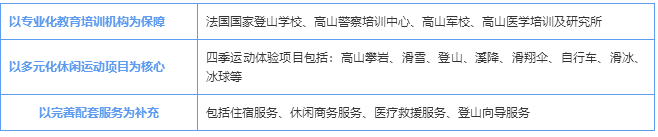 在法國,登山向?qū)︻櫩偷男袨槌袚韶熑?,這些以技術高超、經(jīng)驗豐富,責任感強而著稱的向?qū)冊谌澜缍枷碛惺⒆u。國立登山滑雪學校開設的項目有登山向?qū)А⒒┙叹?、高山協(xié)作、救援、滑翔傘教練。學校設備齊全,配有六個可容納20至80人的會議室、一個可容納220人且配有錄像投影機的階梯教室、一棟配有132個標間的宿舍樓、一個自助餐中心、一個健身房、一個器材室及其它科研場所。因為ENSA的存在,沙木尼成為全球登山標準的定制者,完善的培訓和卓越的服務成為其登山產(chǎn)業(yè)發(fā)展的護城河。