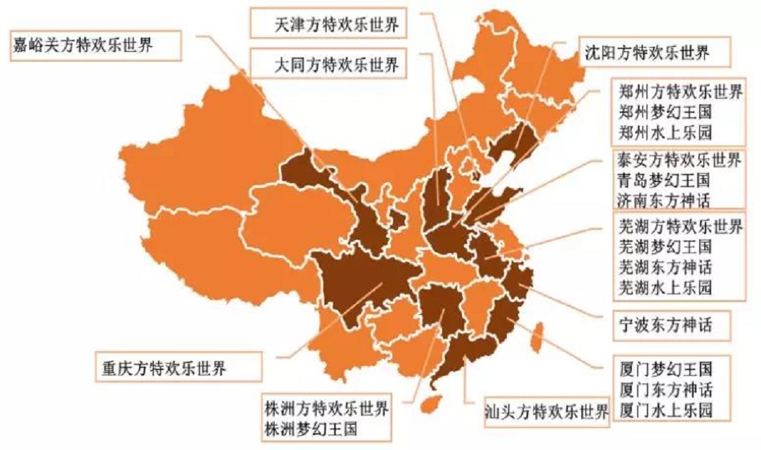 長(zhǎng)隆集團(tuán)有5個(gè)主題公園和2個(gè)馬戲城,以廣東為大本營(yíng),集中布局廣州和珠海度假區(qū),雖然布局城市少,但每一個(gè)度假區(qū)都規(guī)模龐大。未來(lái)長(zhǎng)隆集團(tuán)有意走出廣東,布局海南。