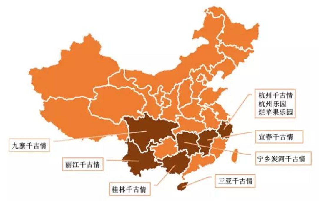 宋城演藝的主題公園主要布局在旅游發(fā)達(dá)城市和地區(qū),目前有9個(gè)主題公園,包括7個(gè)千古情景區(qū),布局城市包括一線(xiàn)旅游城市杭州、三亞、麗江、九寨、桂林,也在二三線(xiàn)旅游城市如寧鄉(xiāng)、宜春進(jìn)行輕資產(chǎn)布局。