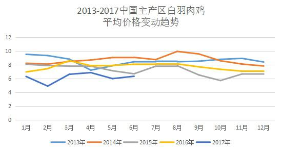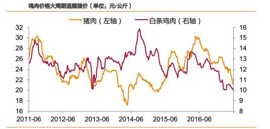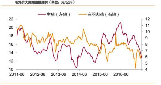 2)短周期內(nèi),受各自供求關(guān)系決定產(chǎn)品價(jià)格,則豬價(jià)、雞價(jià)走勢(shì)有可能會(huì)發(fā)生背離,但背離時(shí)間一般不會(huì)超過(guò)1個(gè)季度,且背離的時(shí)間一般出現(xiàn)在春節(jié)后的上半年。如2012年2月-4月,2014年2月-4月、2015 年3月-6月、2016年3月-6月、2017年2月-3月。