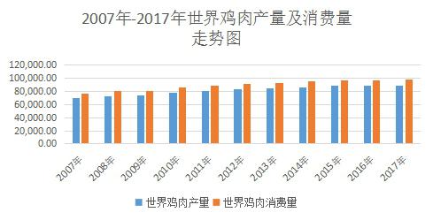 近年來(lái),雞肉產(chǎn)量、銷量呈快速上升趨勢(shì)。根據(jù)wind統(tǒng)計(jì)數(shù)據(jù),世界雞肉生產(chǎn)量保持穩(wěn)定增長(zhǎng),從2007年的69447千噸,增長(zhǎng)到2017年6月的89470千噸,世界雞肉消費(fèi)量從2007年的76487千噸,增長(zhǎng)到2017年6月的98771千噸。