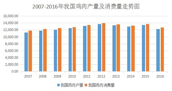 從2007年開始,受H7N9疫情和成本快速上升等因素的困擾,中國(guó)雞肉生產(chǎn)進(jìn)入了平穩(wěn)發(fā)展時(shí)期,雖然增長(zhǎng)速度有所減緩,但是增長(zhǎng)趨勢(shì)依然強(qiáng)勁。2007年至2012年,我國(guó)雞肉年產(chǎn)量及消費(fèi)量持續(xù)增長(zhǎng),2013年以來(lái)受疫情、中央八項(xiàng)規(guī)定等因素的影響,雞肉年產(chǎn)銷量略有下降,但始終保持在1,300萬(wàn)噸以上的水平。雞肉產(chǎn)量從2007年的11291千噸增長(zhǎng)至2016年的12300千噸,雞肉消費(fèi)量從2007年的11773千噸增長(zhǎng)至2016年的12730千噸。