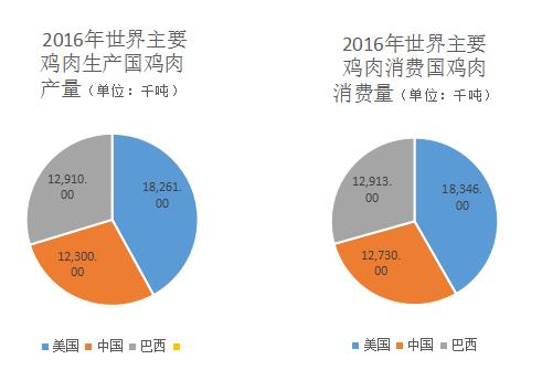 從地區(qū)分布上看,世界前三大雞肉生產(chǎn)和消費(fèi)國(guó)家為美國(guó)、中國(guó)和巴西。美國(guó)為世界雞肉第一大生產(chǎn)國(guó)。根據(jù)wind數(shù)據(jù)統(tǒng)計(jì),2016年,美國(guó)雞肉生產(chǎn)量達(dá)18261千噸;中國(guó)雞肉生產(chǎn)量達(dá)12300千噸;巴西雞肉生產(chǎn)量達(dá)12910千噸。2016年,美國(guó)、中國(guó)和巴西的雞肉消費(fèi)量分別為18346千噸、12730千噸和12913千噸。