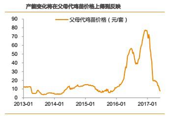 引種規(guī)模的下降意味著祖代存欄的下降,供給的減少將導(dǎo)致父母代雞苗銷售價(jià)格下降。由于2012年以前國(guó)內(nèi)白羽肉雞需求快速增加,因此,國(guó)內(nèi)白羽雞引種規(guī)增速的下降也會(huì)引起價(jià)格的上漲。例如,2010年的引種規(guī)模與2009年基本持平,僅增長(zhǎng)3萬(wàn)套。受此影響,父母代雞苗價(jià)格也從2010年9月份開始反彈。同樣的,隨著2014年引種規(guī)模的下降,父母代雞苗價(jià)格則從2014年3月見底回升,中間雖有波動(dòng),但從2015年10月即開始一輪快速上漲。也就是說(shuō),對(duì)于祖代產(chǎn)能的變化,父母代雞苗價(jià)格是一個(gè)重要的驗(yàn)證指標(biāo)。