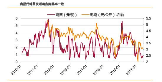 理論上,在產(chǎn)父母代存欄的變動(dòng),3周后將傳導(dǎo)到雞苗環(huán)節(jié)。但實(shí)際上,由于商品代離消費(fèi)者最近,需求端的影響要大于供給端的影響。從數(shù)據(jù)上看,雖然商品代雞苗由于沒有庫(kù)存,產(chǎn)品價(jià)格波動(dòng)幅度遠(yuǎn)大于毛雞價(jià)格的波動(dòng)幅度,但是兩者之間的走勢(shì)卻基本一致,間隔最多不會(huì)超過(guò)1周。因此,判斷毛雞價(jià)格走勢(shì)基本等價(jià)于判斷雞苗價(jià)格。