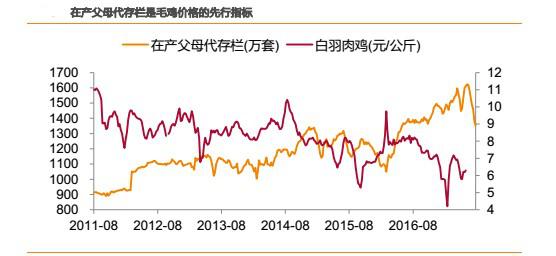 在產(chǎn)父母代存欄是商品代的直接產(chǎn)能,代表了中短期的供給能力。理論上,經(jīng)過(guò)3周孵化期+6 周育肥期后毛雞出欄,則在產(chǎn)父母代存欄是毛雞價(jià)格提前9-10周的先行指標(biāo),與毛雞價(jià)格走勢(shì)呈反相關(guān)。從實(shí)際運(yùn)行來(lái)看,理論上走勢(shì)與實(shí)際走勢(shì)大體吻合。因此,在產(chǎn)父母代存欄是相對(duì)于毛雞價(jià)格提前兩個(gè)多月的先行指標(biāo)。