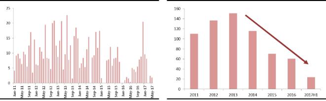 2015年以來(lái),祖代雞引種在持續(xù)收縮過(guò)程中,總量上基本得到了控制。美國(guó)、法國(guó)、西班牙等重要引種來(lái)源國(guó)相繼被封關(guān),目前可以引種的國(guó)家十分有限。2017年上半年各品種共引進(jìn)23萬(wàn)套,比去年同期多出12萬(wàn)套,主要是集中在今年1/2月份。
