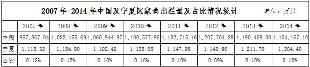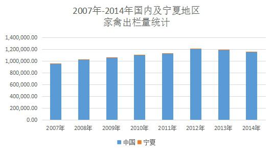 依據(jù)wind數(shù)據(jù),2014年全國(guó)家禽出欄量1154167.1萬(wàn)只,寧夏地區(qū)家禽出欄量達(dá)1204.4萬(wàn)只,占全國(guó)出欄量的0.1%。自2007年以來(lái),寧夏地區(qū)的家禽出欄量一直以0.1%~0.12%的全國(guó)占比,市場(chǎng)占比非常小。