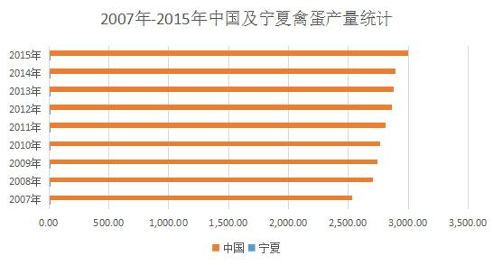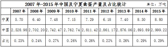 寧夏不僅是在出欄量上所占比重較低,在產(chǎn)量上也并不樂觀。2015年底,中國(guó)總體禽蛋產(chǎn)量為2999.22萬(wàn)噸,而寧夏僅8.8萬(wàn)噸,占全國(guó)的0.29%。2007年以來(lái),寧夏禽蛋產(chǎn)量占比在0.23%~0.29%之間,2014年占比達(dá)到最高。