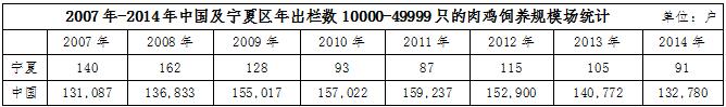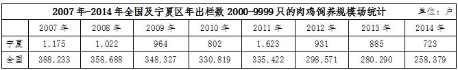 不僅如此,在肉雞飼養(yǎng)場(chǎng)的規(guī)模上也有明顯的差距。據(jù)wind數(shù)據(jù)統(tǒng)計(jì),2014年,寧夏區(qū)內(nèi)肉雞年出欄數(shù)在1-1999只的肉雞飼養(yǎng)規(guī)模場(chǎng)戶數(shù)為133734戶,當(dāng)年全國(guó)同規(guī)模的飼養(yǎng)場(chǎng)戶數(shù)高達(dá)21644679戶,占比為0.62%;年出欄數(shù)在2000-9999只的肉雞飼養(yǎng)規(guī)模戶數(shù),寧夏地區(qū)為723戶,全國(guó)為258379戶,占比0.28%;年出欄數(shù)在10000-49999只的肉雞飼養(yǎng)規(guī)模戶數(shù),寧夏地區(qū)為91戶,全國(guó)為132780戶,占比為0.07%。