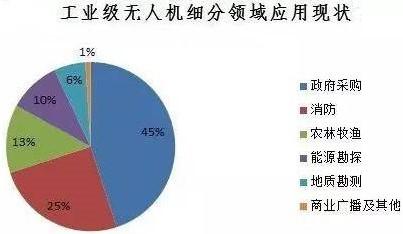 目前,工業(yè)級無人機細分領(lǐng)域中,政府采購占比45%,消防占比25%,農(nóng)林牧漁占比13%,能源勘探占比10%,地質(zhì)勘測占比6%,商業(yè)廣播及其他占比1%。