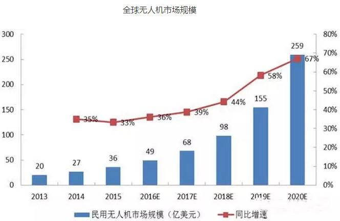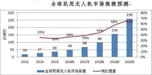 2015年,全球民用無人機市場規(guī)模為36億美元,同比增長33%。據(jù)中國產(chǎn)業(yè)信息網(wǎng)預(yù)測,到2020年全球民用無人機市場規(guī)模預(yù)計可達259億美元,年均復(fù)合增長率為42%。