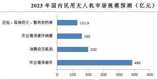 預(yù)計到2023年,我國民用無人機各細分應(yīng)用領(lǐng)域的市場份額分別為:消費級及航拍無人機市場200億元,農(nóng)業(yè)植保硬件銷售160億元,農(nóng)業(yè)植保服務(wù)485億元,巡檢、森林防火、警用安防等領(lǐng)域共計131.9億元,合計976.9億元。