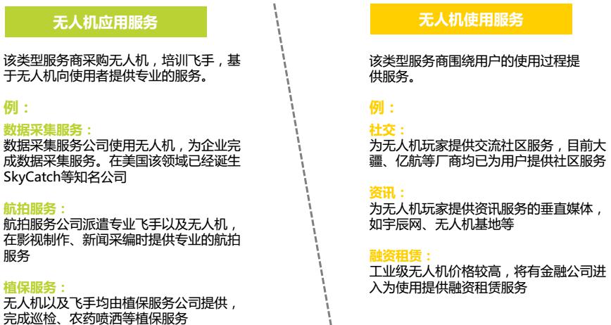 無人機產(chǎn)業(yè)鏈除了傳統(tǒng)的生產(chǎn)制造環(huán)節(jié)外,還出現(xiàn)了針對用戶使用過程的社交、保險以及數(shù)據(jù)采集、航拍等基于應(yīng)用場景的產(chǎn)業(yè)服務(wù)。