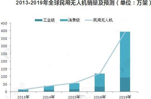 全球民用無人機在2014年迎來大約37.8萬架的銷量,其中工業(yè)級無人機銷量約12.6萬架,消費級無人機銷量約25.2萬架。在2015年大約銷售民用無人機56.9萬架,其中,工業(yè)級無人機銷量約17.1萬架,消費級無人機銷量約39.8萬架。IDC預(yù)測,到2019年全球無人機年銷量將達到393萬架,其中消費級300萬臺,CAGR達到60%;工業(yè)級無人機銷量為93萬臺,CAGR達到45%。