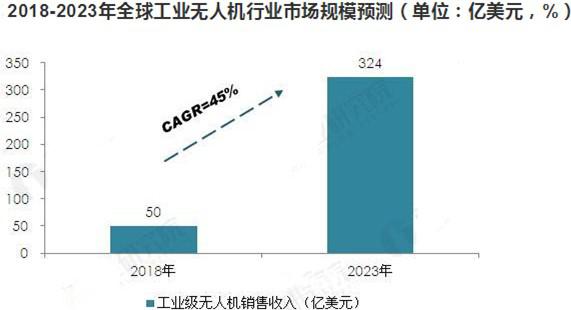 隨著工業(yè)級無人機技術(shù)的不斷發(fā)展,未來工業(yè)級無人機將呈爆發(fā)式增長。結(jié)合國際權(quán)威機構(gòu)對未來工業(yè)級無人機行業(yè)發(fā)展趨勢的判斷,預(yù)計到2023年,全球工業(yè)級無人機市場規(guī)模將超過300億美元。2018-2023年行業(yè)年均復(fù)合增長率將維持在45%左右。