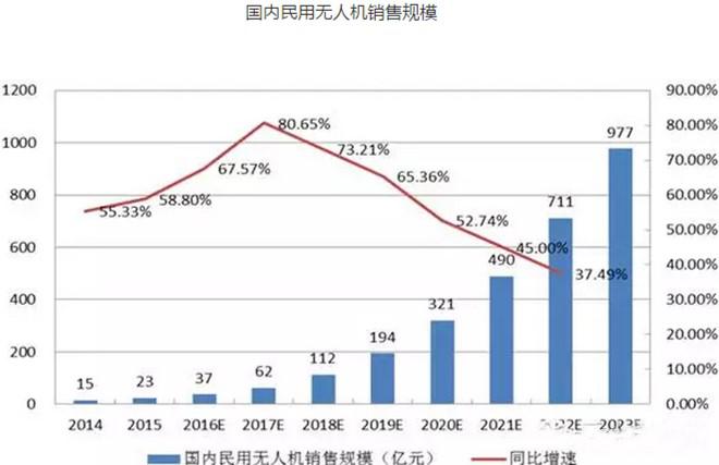2015年,國內(nèi)民用無人機市場規(guī)模為23.3億元,同比增長55.3%。據(jù)IDC預(yù)測,到2019年國內(nèi)民用無人機市場規(guī)模預(yù)計可達390萬架,合計約為600億元。據(jù)東興證券研究所預(yù)測,到2023年國內(nèi)無人機市場規(guī)模預(yù)計可達976.9億元,年均復(fù)合增長率為59%。
