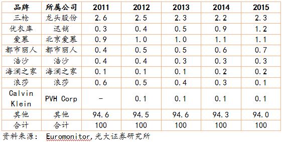 內(nèi)衣作為消費者的第二層“肌膚”,消費者對內(nèi)衣的消費比其他成衣具備更強的忠誠度,進入 21 世紀后,消費者對內(nèi)衣品牌的認可也越來越強。 雖然部分品牌由于品牌老化導致市占率降低,但是總體看,前 16 家女士內(nèi)衣品牌的市場份額從 2011 年的 13.9%提升到了 2015 年的 15%。前八大男士內(nèi)衣品牌的市占率從 5.4%提升到 6%。
