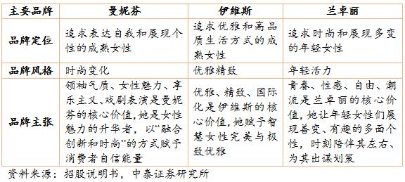 公司實行多品牌運作戰(zhàn)略,針對不同年齡段和不同風格的消費者推出三個中高端核心品牌“曼妮芬”、 “伊維斯”和“蘭卓麗”,三個副牌COYEEE、Bodybeauty 和喬百仕。其中,主打品牌“曼妮芬”連續(xù) 12 年市占率第一,其市占率長期領先于規(guī)模最大的內(nèi)衣公司安莉芳的主品牌“安莉芳”。第二大品牌“伊維斯”連續(xù)兩年市場份額排名前十。