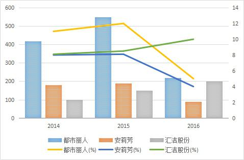 匯潔股份的亮點,主要是互聯(lián)網(wǎng)先發(fā)優(yōu)勢。2016年底,電商銷售收入已經(jīng)占到匯潔股份銷售額的近20%,而安莉芳與都市麗人的這一比例僅分別為5%,7%。除了重視電商銷售,公司還推出了電商品牌COYEEE,成立3年銷售額已達4400萬元。