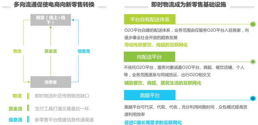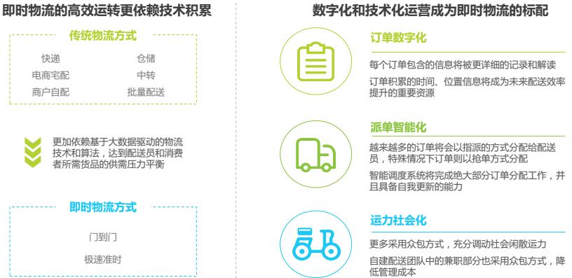 快速、及時(shí)、實(shí)時(shí)的物流實(shí)現(xiàn)路徑是“新零售” 的必備條件,即時(shí)物流在居民生活中扮演著越來越重要的角色,物流能力向下滲透觸及居民生活的方方面面,為衣食住行的全方位互聯(lián)網(wǎng)化提供現(xiàn)實(shí)基礎(chǔ),未來新零售趨勢下的即時(shí)需求比重會(huì)逐步增加。