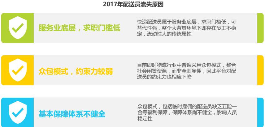 維持穩(wěn)定的配送員團(tuán)隊(duì),對(duì)于配送平臺(tái)的發(fā)展至關(guān)重要。但目前即時(shí)物流行業(yè)存在配送人員流失率高的難題。究其原因,存在以下三方面的因素:求職門檻低、可替代性強(qiáng),平臺(tái)對(duì)人員的約束力較弱以及基本保障體系不健全。