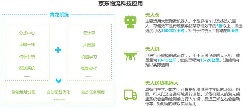 京東于2016年成立了X事業(yè)部,專注智慧物流相關(guān)技術(shù)的研發(fā)。2017年4月京東物流宣布獨(dú)立運(yùn)營,成立物流子公司。截止2017年6月,京東在全國范圍內(nèi)擁有256個(gè)大型倉庫,6906個(gè)配送站和自提點(diǎn),包括已經(jīng)運(yùn)營了7個(gè)大型智能化物流中心“亞洲一號(hào)”。目前京東自營配送覆蓋了全國98%的人口,壓縮商品流通成本70%,提升物流運(yùn)營效率2倍以上。京東物流科技的應(yīng)用主要包括兩個(gè)方面,一是基于大數(shù)據(jù)預(yù)測分析技術(shù)實(shí)現(xiàn)智能化的調(diào)度、決策;二是采用一些更自動(dòng)化、智能化的設(shè)備提升物流效率,最終提升客戶的體驗(yàn)。