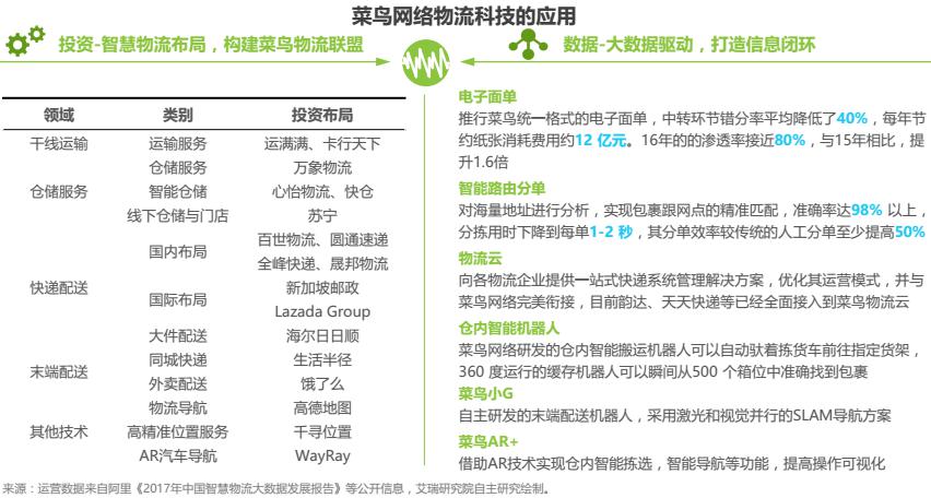 菜鳥網(wǎng)絡(luò)成立于2013年5月,定位于以數(shù)據(jù)驅(qū)動(dòng)、社會(huì)化協(xié)同的物流及供應(yīng)鏈平臺(tái)。主要業(yè)務(wù)有倉配網(wǎng)絡(luò)、跨境網(wǎng)絡(luò)、快遞平臺(tái)和ET.物流實(shí)驗(yàn)室,以覆蓋全國的倉配網(wǎng)絡(luò)和大數(shù)據(jù)決策平臺(tái)為基礎(chǔ),構(gòu)建專業(yè)高效的供應(yīng)鏈服務(wù)。為了提高網(wǎng)絡(luò)效率,一方面菜鳥以投資參股的形式構(gòu)建菜鳥聯(lián)盟,另一方面加大科技研發(fā)的投入,積極布局智慧物流。