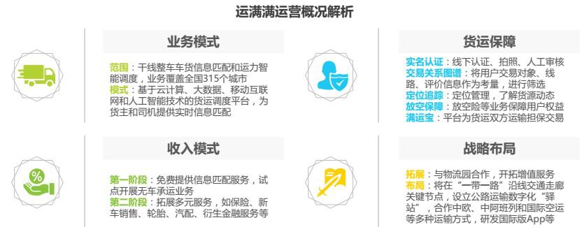 運(yùn)滿滿成立于2013年,是基于云計(jì)算、大數(shù)據(jù)、移動(dòng)互聯(lián)網(wǎng)和人工智能技術(shù)開發(fā)的貨運(yùn)調(diào)度平臺(tái),為貨主和司機(jī)提供實(shí)時(shí)信息匹配,減少貨運(yùn)空載率、提高物流運(yùn)行效率。由于模式相近,運(yùn)滿滿被業(yè)界稱為“貨運(yùn)版的滴滴”,成立3年來共獲得7輪融資,目前估值超過10億美金。截止2017年9月底,平臺(tái)實(shí)名注冊重卡司機(jī)400余萬、貨主100余萬,業(yè)務(wù)覆蓋全國 315 個(gè)城市。運(yùn)滿滿最新推出擔(dān)保交易產(chǎn)品“滿運(yùn)寶”,為貨運(yùn)雙方提供運(yùn)費(fèi)擔(dān)保。此外,運(yùn)滿滿還與阿里云、菜鳥、螞蟻金服、平安保險(xiǎn)、中國聯(lián)通、中國重汽等開展深度戰(zhàn)略合作,通過跨界融合,不斷推出創(chuàng)新產(chǎn)品和服務(wù)。未來,運(yùn)滿滿將借助人工智能、無人駕駛、區(qū)塊鏈等技術(shù)驅(qū)動(dòng),提供貫穿全產(chǎn)業(yè)鏈的線上線下服務(wù),構(gòu)建公路物流生態(tài)圈,打造綜合性的貨運(yùn)平臺(tái)。