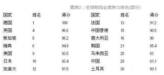 國家的物流業(yè)總體競爭力不僅取決于基礎(chǔ)設(shè)施建設(shè)水平,還取決于整個(gè)物流產(chǎn)業(yè)的管理水平、第三方物流企業(yè)發(fā)展水平和第四方物流企業(yè)的整合能力。從國家層面來看,世界銀行發(fā)布的報(bào)告顯示,在全球物流業(yè)競爭力排行榜(Logistics Performance Index)中,歐洲國家表現(xiàn)最為突出,前20名中超過60%的企業(yè)來自歐洲,亞洲物流業(yè)競爭力最強(qiáng)的國家/地區(qū)是日本(排名第十),其次為中國香港和臺(tái)灣地區(qū),中國大陸在全球僅排名第28??傮w而言,發(fā)展中國家在基礎(chǔ)設(shè)施、國際運(yùn)輸、物流能力、交貨及時(shí)性等方面還與歐美等發(fā)達(dá)國家存在較大的差距,物流業(yè)的全球競爭能力還十分有限。