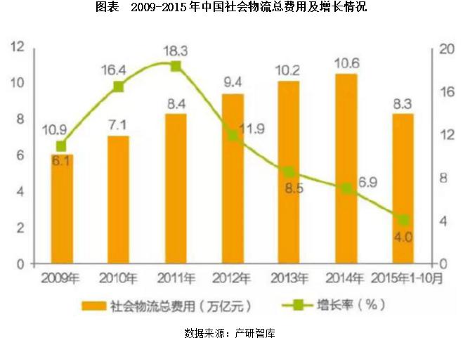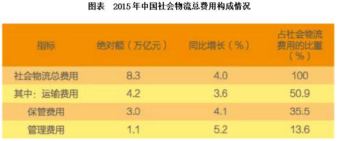 2014年社會(huì)物流總費(fèi)用10.6萬億元,同比增長6.9%。社會(huì)物流總費(fèi)用與GDP的比率為16.6%,比上年下降0.3個(gè)百分點(diǎn)。其中,運(yùn)輸費(fèi)用5.6萬億元,同比增長6.6%,占社會(huì)物流總費(fèi)用的比重為52.9%;保管費(fèi)用3.7萬億元,同比增長7.0%,占社會(huì)物流總費(fèi)用的比重為34.9%;管理費(fèi)用1.3萬億元,同比增長7.9%,占社會(huì)物流總費(fèi)用的比重為12.2%。