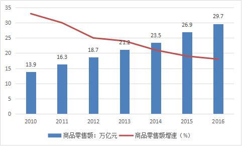2016年我國商品零售額為296518億元,同比增長10.4%,增速比上年降低0.2個百分點(diǎn),降幅比上年收窄1.4個百分點(diǎn)。