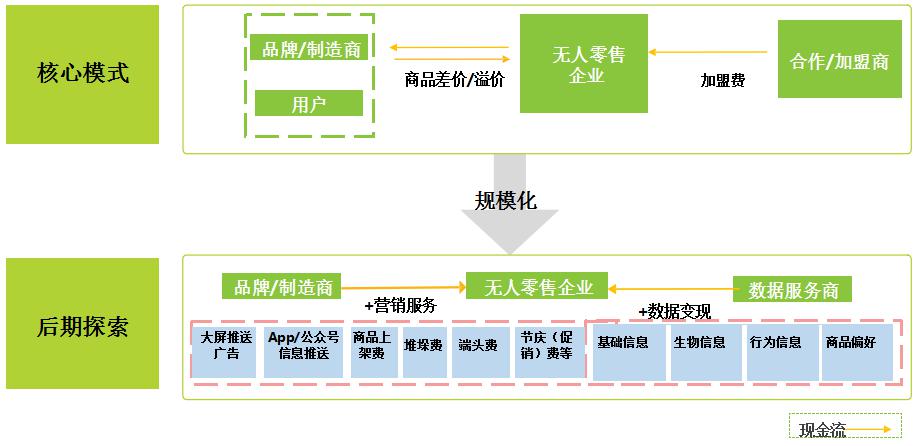 無人零售企業(yè)收入來源以銷售商品賺取差價為主,并且通過規(guī)?;岣咦h價能力降低采購成本。此外,從加盟商獲取加盟費(fèi)用的商業(yè)模式也已經(jīng)開始推行。無人零售發(fā)展至中后期,企業(yè)數(shù)據(jù)更為龐大,其盈利模式將隨之產(chǎn)生更多的想象空間,以互聯(lián)網(wǎng)思路開展?fàn)I銷服務(wù)、數(shù)據(jù)變現(xiàn)等都是比較成熟的可參考模式。