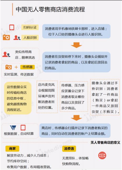 國內(nèi)目前的無人零售店的消費(fèi)流程主要分為:掃碼認(rèn)證或人臉識別、挑選商品、根據(jù)數(shù)據(jù)自動結(jié)算這些環(huán)節(jié)。對于商家而言,可以節(jié)約人力成本和沉淀消費(fèi)數(shù)據(jù),對于消費(fèi)者而言,則可以增強(qiáng)體驗(yàn)感和減少排隊(duì)時間。