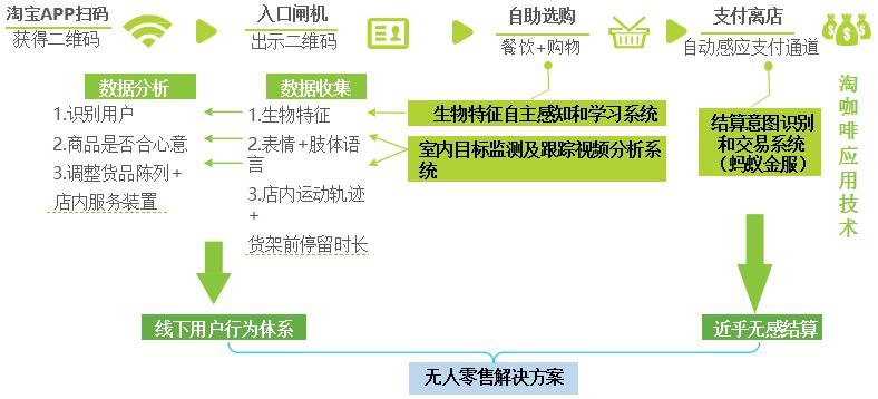 2017年7月阿里巴巴在淘寶造物節(jié)上推出無人便利店淘咖啡。淘咖啡經(jīng)營面積約200平米,分成超市區(qū)(無店員)和餐飲點(diǎn)單區(qū)(有少量店員),可一次性容納客流50人左右。消費(fèi)者通過手機(jī)淘寶 APP 掃碼進(jìn)店,選購?fù)瓿珊笮柰ㄟ^兩道結(jié)算門,當(dāng)?shù)谝坏篱T感應(yīng)到消費(fèi)者的離店需求時即會開啟,消費(fèi)者走出第一道門后,系統(tǒng)會自動對所購買商品進(jìn)行識別與結(jié)算,結(jié)算完成后第二道門自動打開,消費(fèi)者離店。