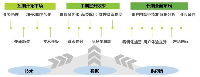 中期:企業(yè)的運(yùn)營重點(diǎn)在于供應(yīng)鏈與管理效率的提升,包括企業(yè)進(jìn)行技術(shù)算法提升,并將供應(yīng)鏈進(jìn)行網(wǎng)狀轉(zhuǎn)變,同時擴(kuò)充或開發(fā)零售多場景,覆蓋主要消費(fèi)場景,品類、商品組合進(jìn)入精選模式,根據(jù)不同用戶個性化/精準(zhǔn)化推送等。