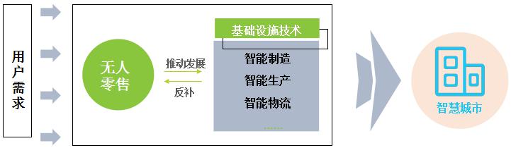 以無人店和開放貨架為代表的無人零售市場雖然才剛剛開始,在政策不斷規(guī)范并且進(jìn)一步鼓勵無人零售業(yè)態(tài)發(fā)展的環(huán)境和數(shù)據(jù)、技術(shù)、供應(yīng)鏈等多環(huán)節(jié)共同促進(jìn)下的情況下,無人零售市場三大業(yè)態(tài)相互配合且與傳統(tǒng)業(yè)態(tài)緊密融合。無人零售用戶消費(fèi)習(xí)慣將逐漸被培養(yǎng)成熟并且倒逼傳統(tǒng)市場不斷改革(降本增效、提升體驗(yàn)),無人零售帶動智能制造、智能物流等基礎(chǔ)設(shè)施技術(shù)不斷發(fā)展突破,無人便利店,無人倉庫,無人機(jī)等之間相互配合,全鏈條智能化空間進(jìn)一步提升。這些技術(shù)的突破又將反補(bǔ)無人零售行業(yè)的發(fā)展,人們生活便捷度進(jìn)一步提升,成為推動智慧城市發(fā)展的要素之一。