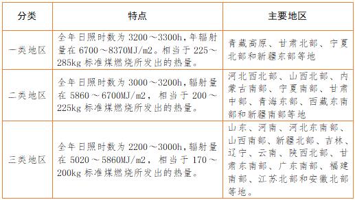 太陽能資源的分布與各地的緯度、海拔高度、自然地理狀況和氣候條件有關。我國屬太陽能資源豐富的國家之一,全國總面積2/3以上地區(qū)年日照時數(shù)大于2000h,根據(jù)中國氣象局風能太陽能評估中心推薦的國內太陽能資源地區(qū)分類辦法,共分5類,其中: